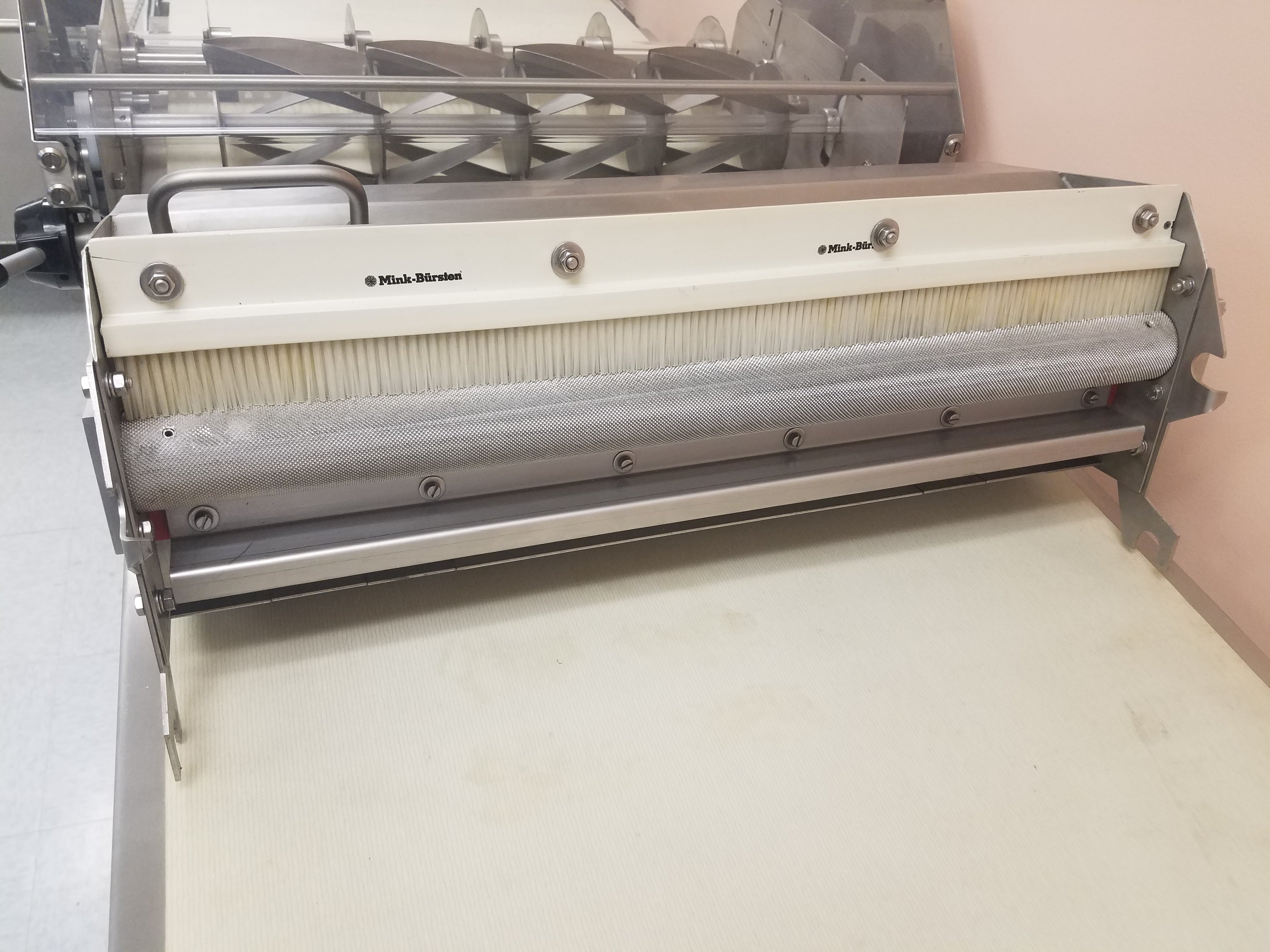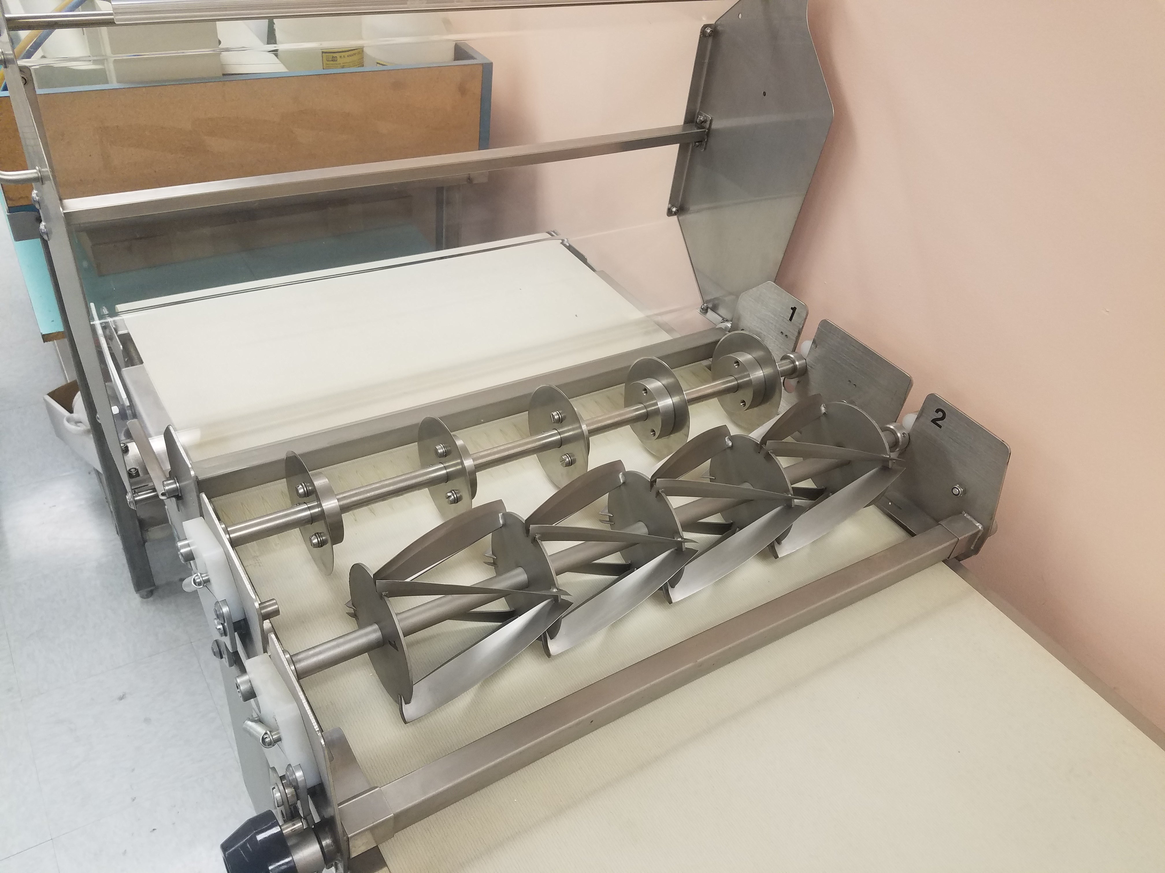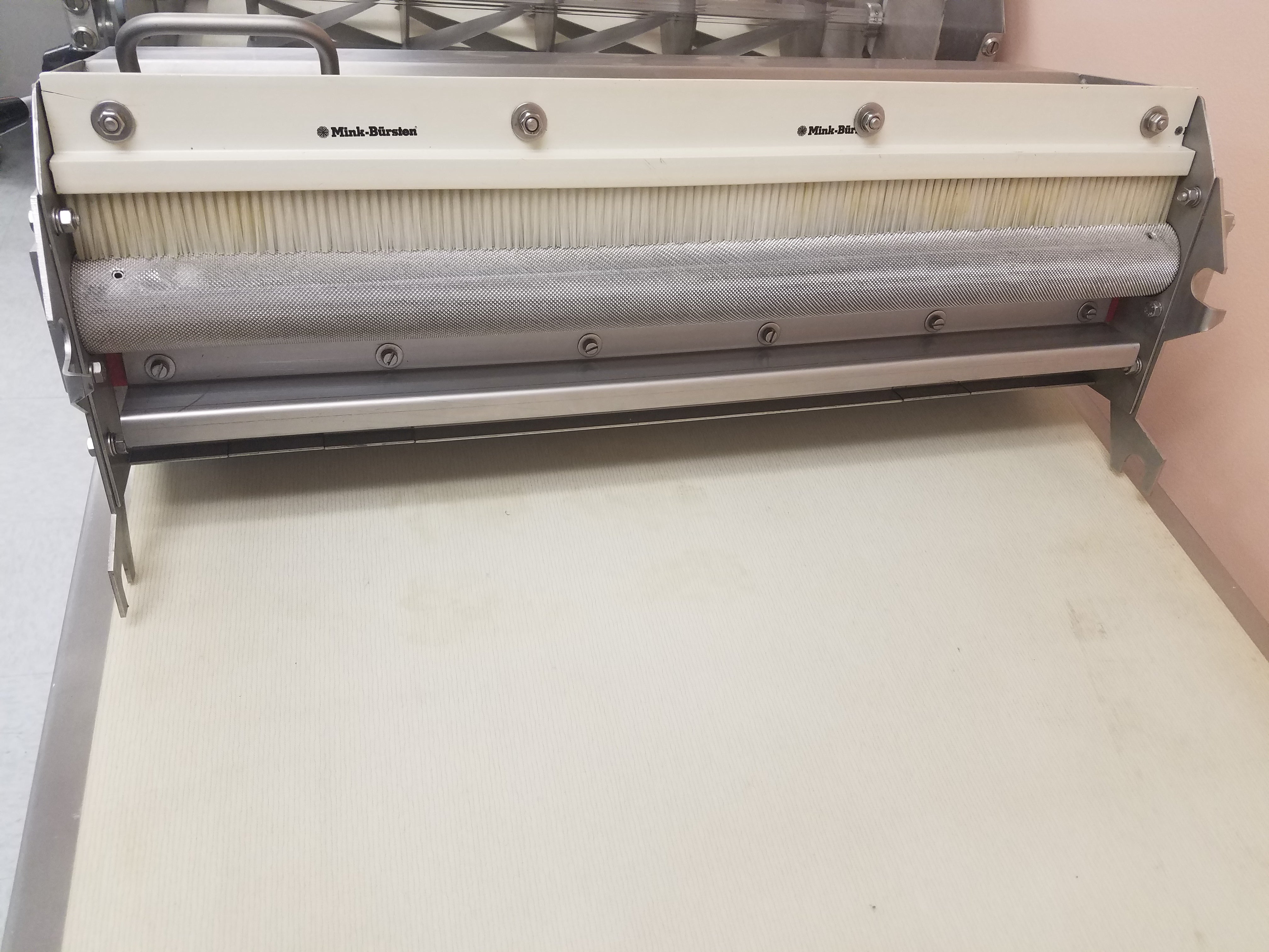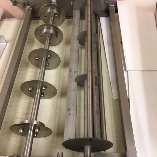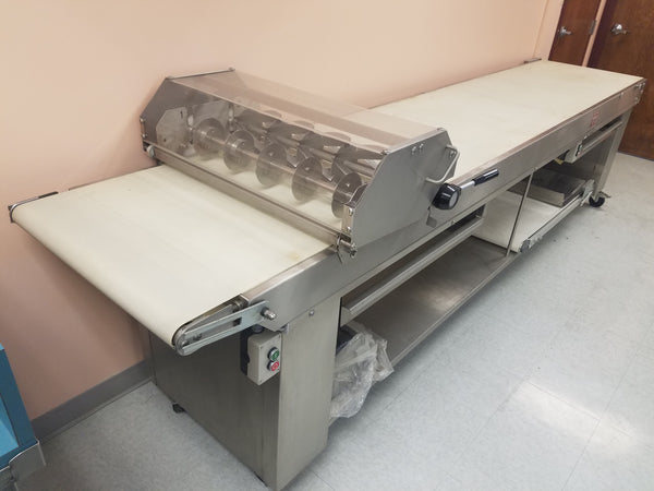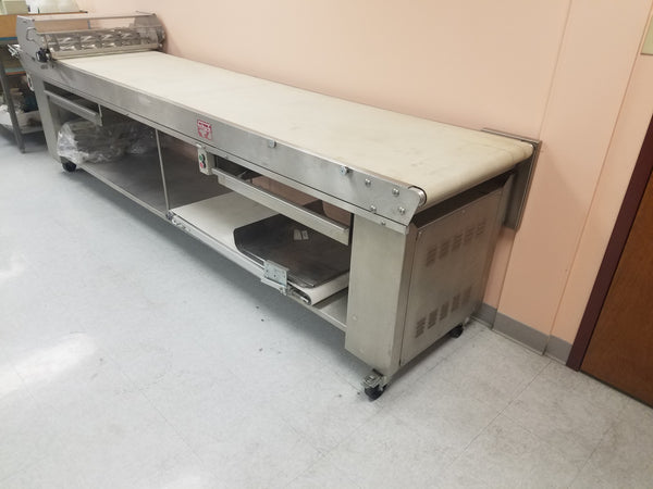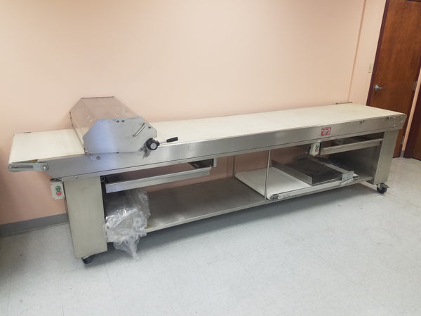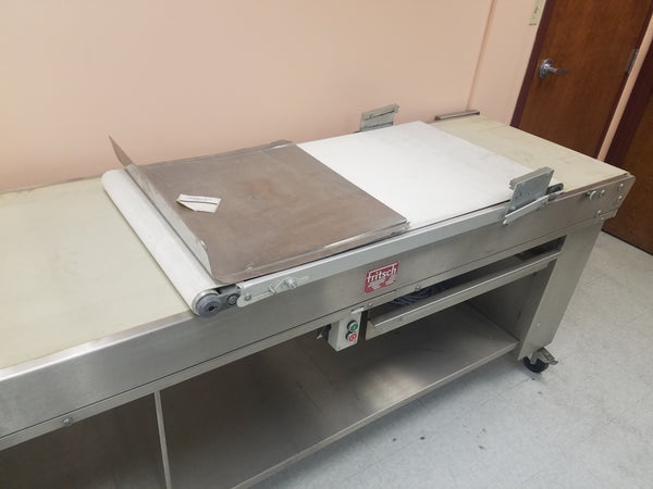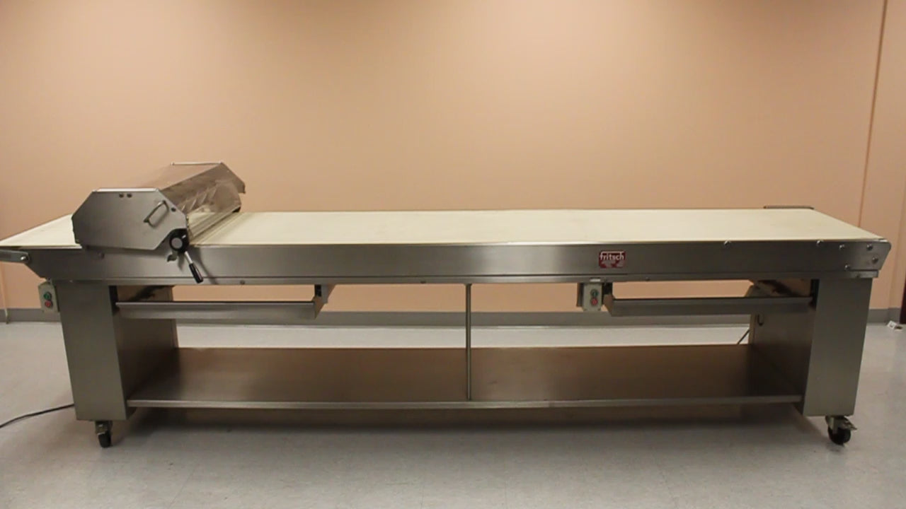 This cutting table is designed for use with the Fritsch FT 350/700 and is offered as a new, unused showroom item. The unit was manufactured to commercial bakery standards and has not been placed into production service.
